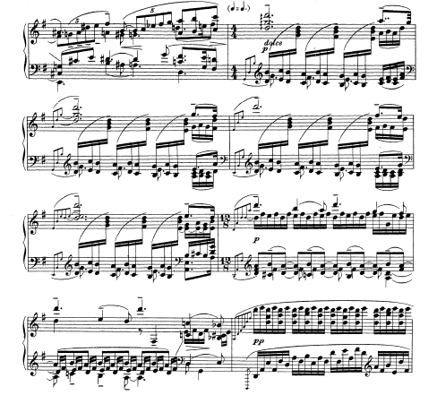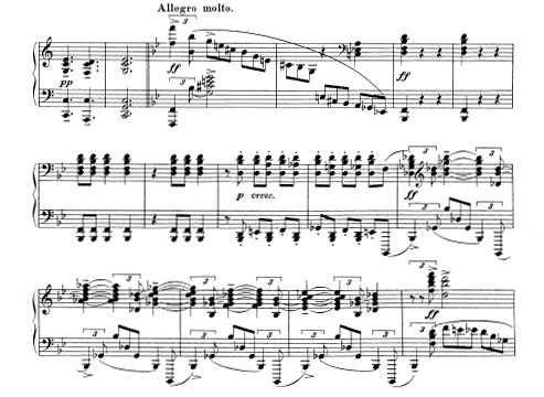 第3楽章 アレグロの部分を分析してみると、第1楽章の最初の部分と瓜二つではないか。譜面づらは異なって見えても音の扱いが同じなのである。もう少し分かりやすく言うと衣装を着替えても中の人間は変わらないのと同じである。一種のヴァリアンテではあるが、ドイツ系作曲家の発展変化の過程を楽しむのと違い、これがラフマニノフの独特な個性である。一つの物事にしつっこく執着する癖は後期のものほど顕著である。